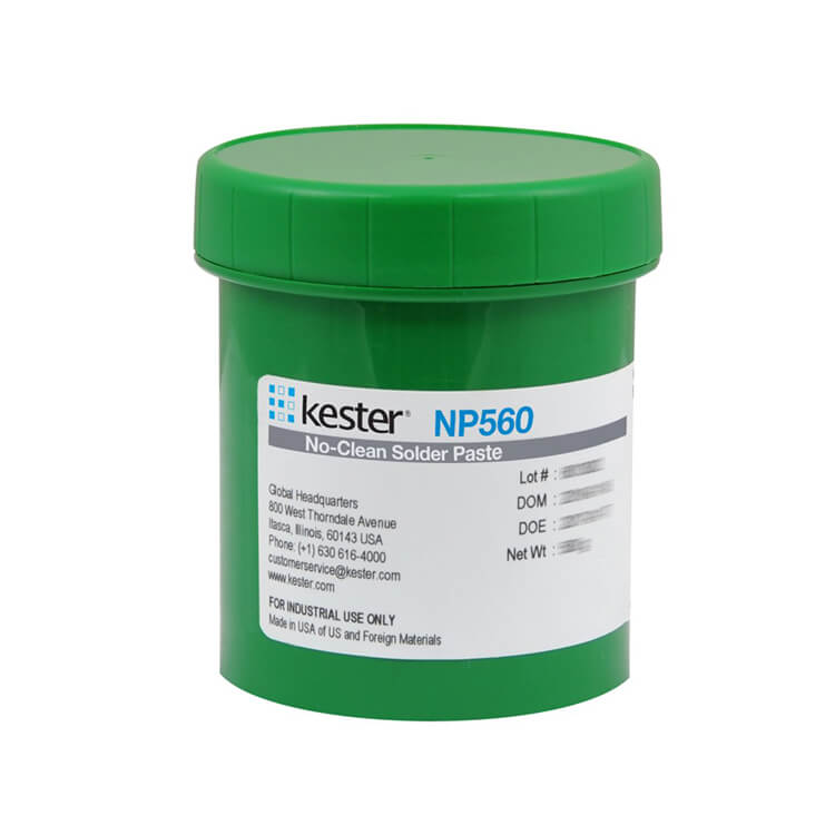 Shelf life is 9 months from date of manufacture when stored in refrigeration and can be stored up to 4 weeks at room temperature (up to 27oC/80oF) with minimal impact to overall product performance. Refrigeration (0-10°C/32-50°F) is the recommended storage condi- tion for solder paste to maintain consistent viscosity, reflow characteristics, and overall performance. When refrigerated, NP560 should be stabilized to room temperature prior to use. Kester is continuing with NP560 shelf life study at refrigerated and room temperature storage conditions to validate up to 12 months. Please contact Kester Technical Support if you require additional advice with regards to handling and storage of this material.